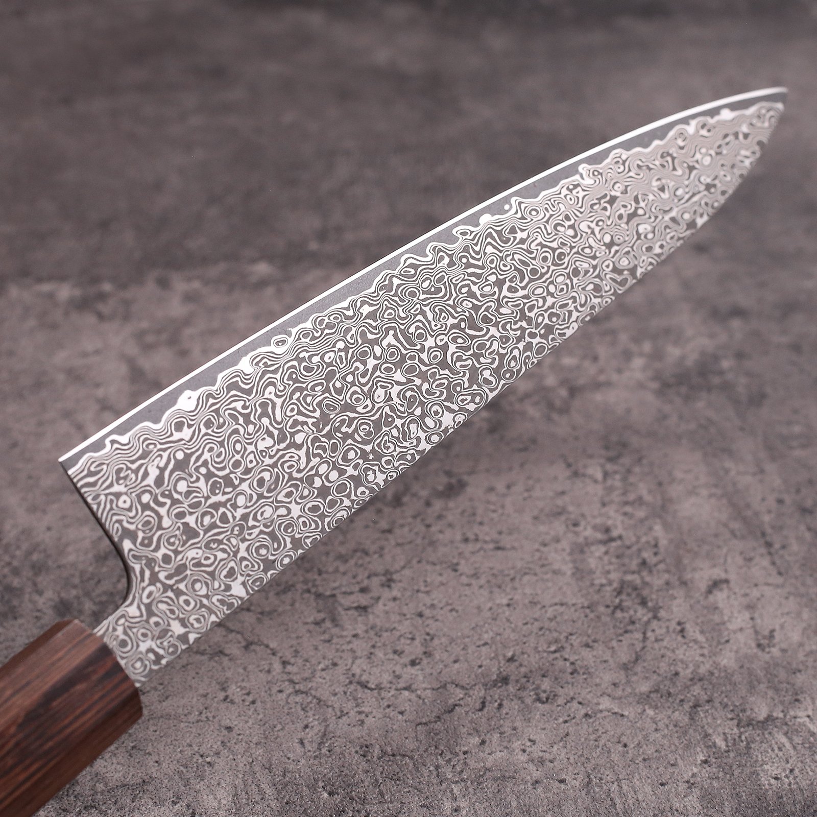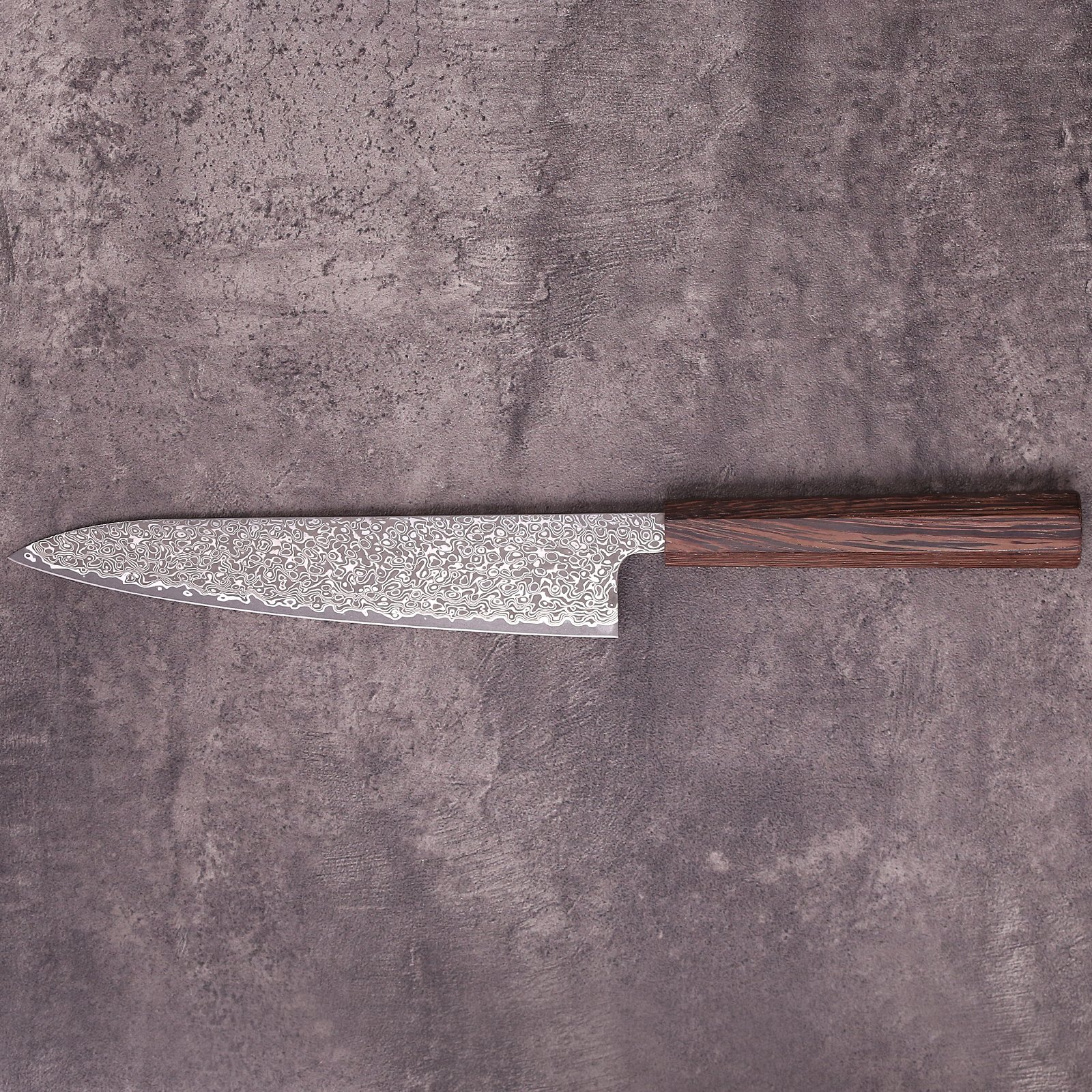Klassisches japanisches Kochmesser mit DV‑10 Damaststahlkern und edlem Wengeholzgriff.